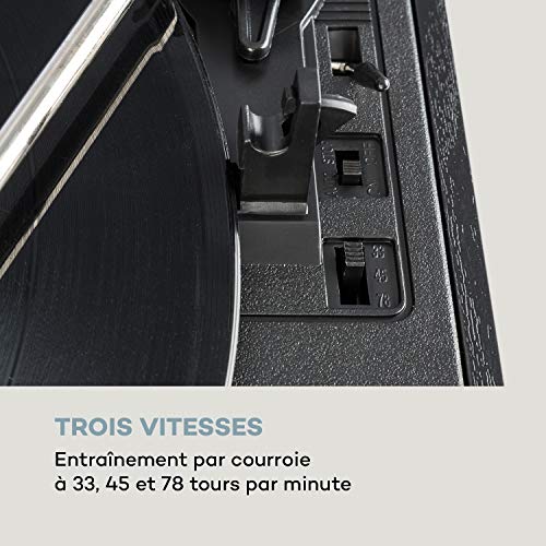 Trois vitesses : entraînement par courroie à 33, 45 & 78 tours par minute | On tourne rond : avec lecteur CD rétractable
