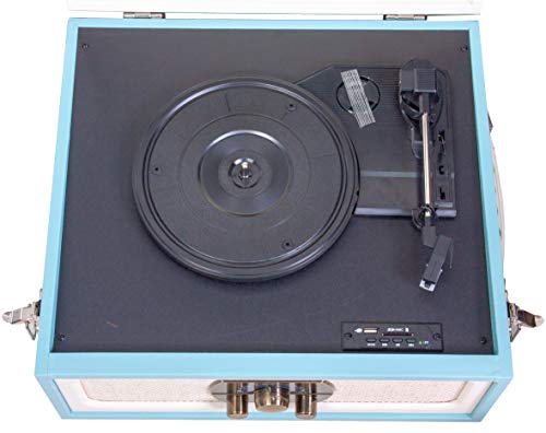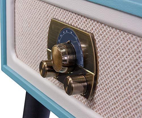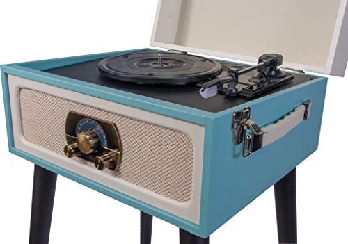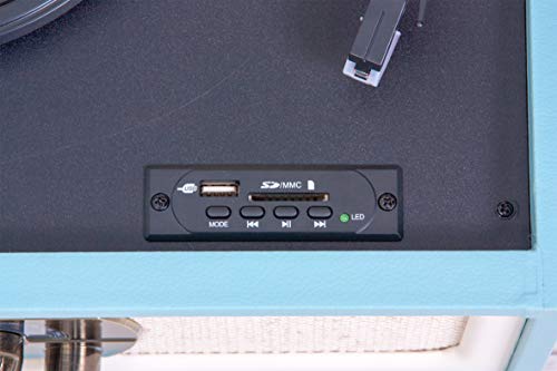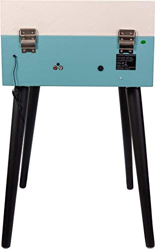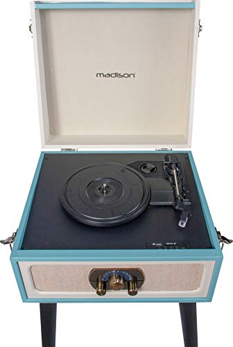 MAD-LPRETRO-MKII – MADISON – Meuble Tourne-Disque (33, 45, 78 Tours) rétro sur Pieds avec Haut-parleurs intégrés, Bluetooth, FM, USB – Adaptateur 45 Tours Inclus – Bleu Clair Cuir